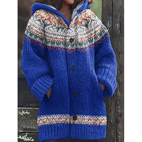 Per donna Felpa Cardigan Elegante Moda Streetwear Geometrico A righe Con Cappuccio Tasca Lavorato a maglia Stampato Manica Lunga Top Regolari Maglia All'aperto Quotidiano Weekend Blu marino Blu Reale