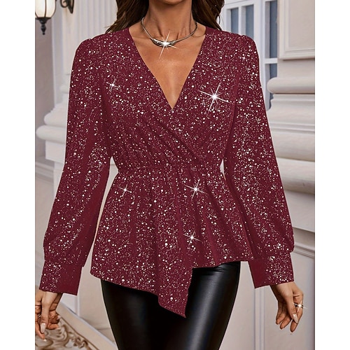 Per donna Camicia Elegant Raso/Satin Blusa Semplice Attivo Elegante Manica Lunga Scollo a V Top Regolari Ferie Uscire Paillettes Orlo asimmetrico Nero Vino Autunno Inverno