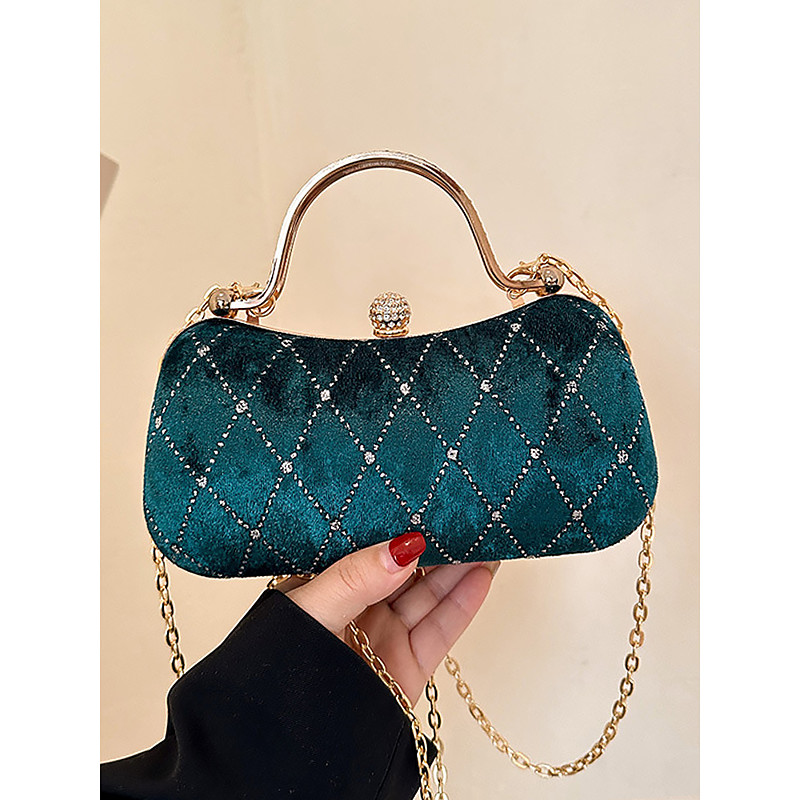 Women's Velvet Quilted Evening Purse with Diamond Accents - Elegant Shoulder Bag for Christmas Party, Holiday Gatherings, and Special Occasions