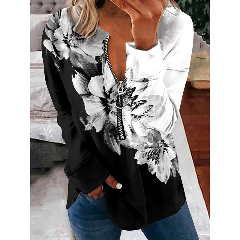 Women's Pullover Sweatshirt Zip Up Sweatshirts Floral Graphic Fashion Casual Long Sleeve Crew Neck Regular Tops Street Dailywear Zipper Print Black Fall Winter