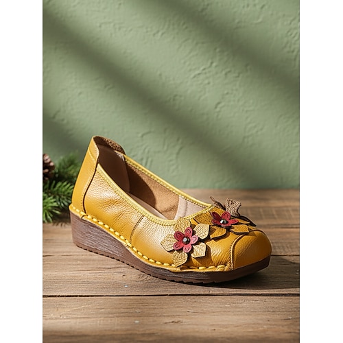 scarpe basse da donna in vera pelle rossa con fiori – comode scarpe slip-on con zeppa e fiori retrò 3D fatti a mano per lavoro e abbigliamento casual
