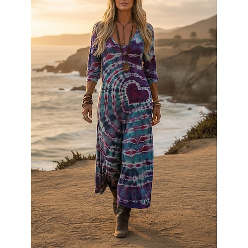 Per donna Abito maxi Abito Boho Abito Vintage Vestito Casual Vintage Quotidiano All'aperto Vacanza Vestibilità comoda Cuore Tinta a nodi Manica Lunga Scollo a V Viola Primavera Autunno