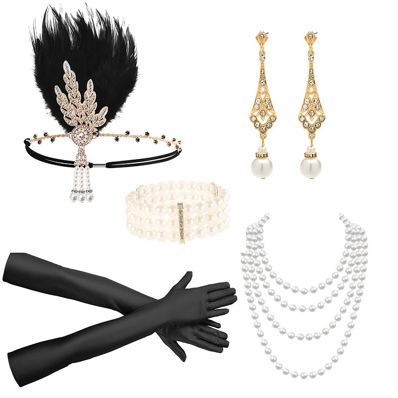 Der große Gatsby Flapper-Stirnband Der große Gatsby Feder Retro Funkelnder Glitzer Kostüm Damen Karneval Valentinstag Maskerade Party-Abendmode Maskerade Festival Erwachsene 1 Armband Handschuhe