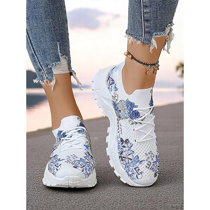 Women's Flyknit Sneakers with Blue Butterfly Print – Fashionable Lightweight Trainers for Walking, Casual Outings and Travel