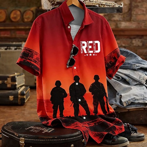 Herren Tarnung Militär Veteranen Hemd Sommerhemd Knopfhemd Kurzarm Vintage-Retro Patriotisch Outdoor Ferien Sommer Frühling Umlegekragen 3D-Druck Hemden mit Kragen Rot orange Rot 1 Rote