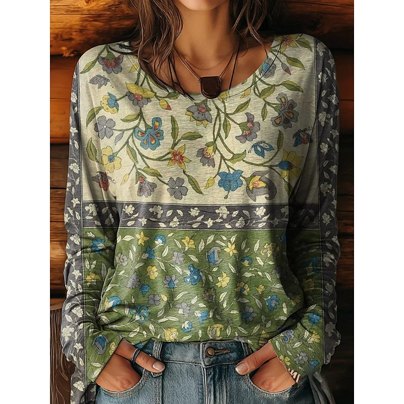 Women's T Shirt Graphic Geometric Plants Vintage Stylish Casual Long Sleeve Crew Neck Regular Tops Daily Weekend Print Blue Pink Sky Blue Fuchsia Orange Spring Fall Winter