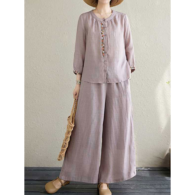 Women's Elegant Vintage Fashion Shirt Linen-Inspired Sets Two Piece Sets Chinos Pants Trousers Long Sleeve Crew Neck Solid Color Outdoor Work Casual Purple Beige Summer Regular Fit