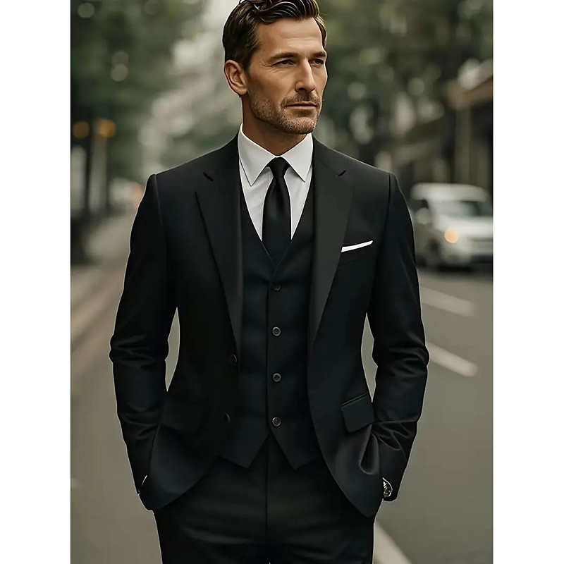 Men's Winter Wedding Semi Formal Business Suits Notch Lapel Black Burgundy Business Formal Solid Colored Tailored Fit 3 Piece Single Breasted Two-buttons