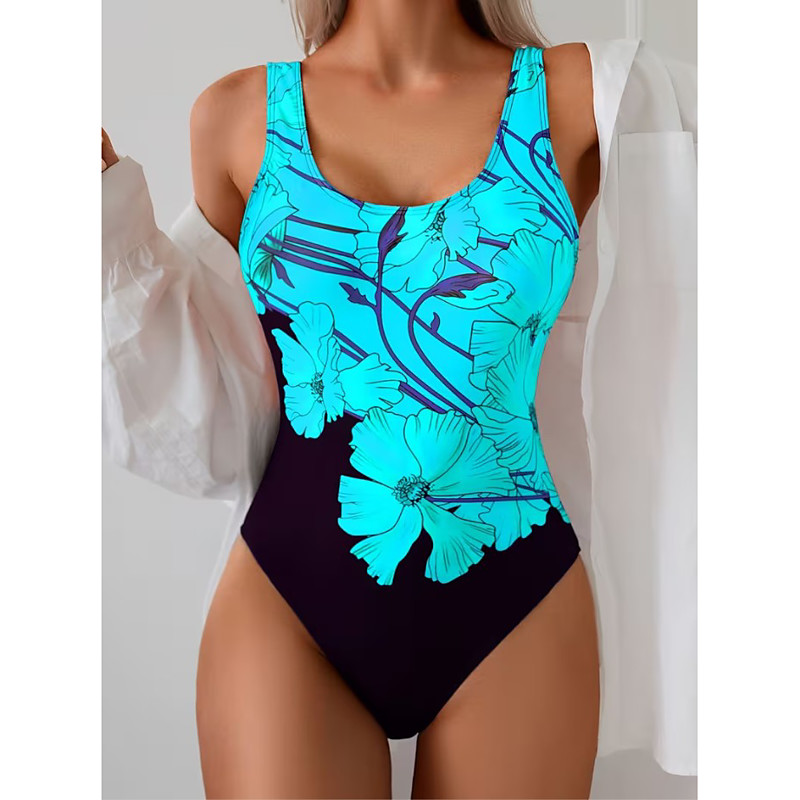 Women's One Piece Swimsuit Boho Monokini Skirt Tummy Control High Waist Slim Backless Vacation Beach Wear Floral Graphic Halter Neck Sleeveless Bathing Suits