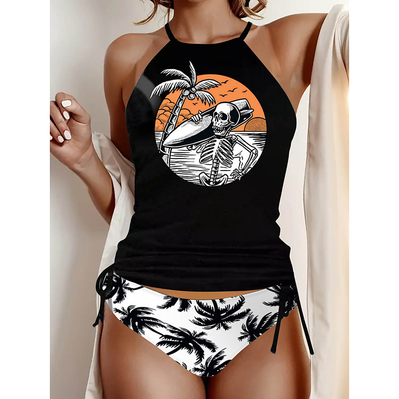 Women's Tankini 2 Piece Swimsuit Ruched Sexy Cutout with Skirt Skirt Tummy Control High Waist Slim Backless Vacation Beach Wear Camo Halter Neck Sleeveless Bathing Suits