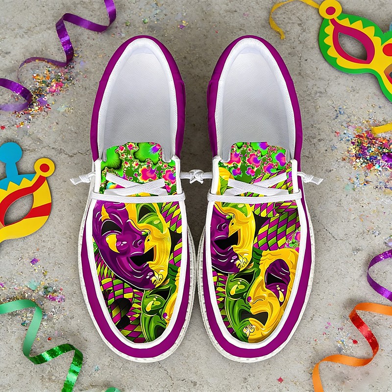 Men's Mardi Gras Themed Slip-On Boat Shoes - Vibrant Purple Green Masquerade Print Casual Shoes, Lightweight Comfort for Carnival Parades, Festival Outings, Casual Gatherings Themed Parties