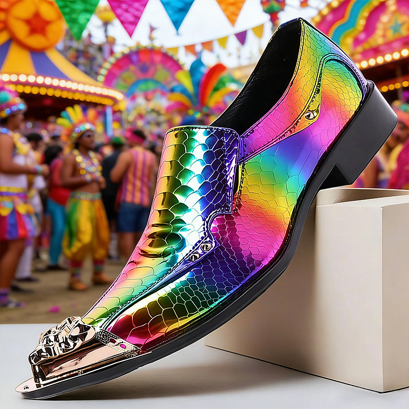 Men's Rainbow Iridescent Slip-On Shoes, Colorful Festival Shoes with Shiny Finish, Perfect for Carnival, Mardi Gras and Vibrant Party Events, Comfortable and Stylish