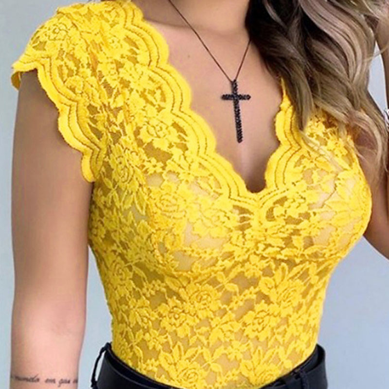 Women's Blouse Lace Tops Solid Color Plain Vintage Cute Ladies Sleeveless V Neck Crop Tops Work Daily Holiday Lace Tunic Black White Yellow Pink Wine Summer Spring