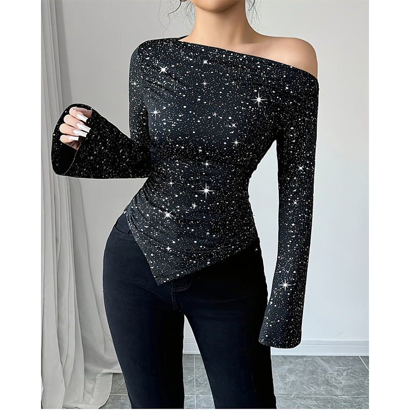 Women's Blouse Dressy Tops Tight Tops Sequin Tops Plain Elegant Vintage Ladies Long Sleeve Off Shoulder Regular Tops Daily Work Holiday Ruched Sequins Patchwork Black Summer Spring