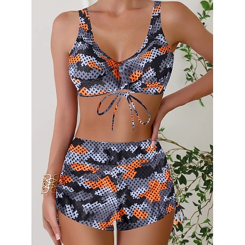 Women's Tankini 2 Piece Swimsuit Ruched Sexy Cutout with Skirt Skirt Tummy Control High Waist Slim Backless Vacation Beach Wear Camo Halter Neck Sleeveless Bathing Suits