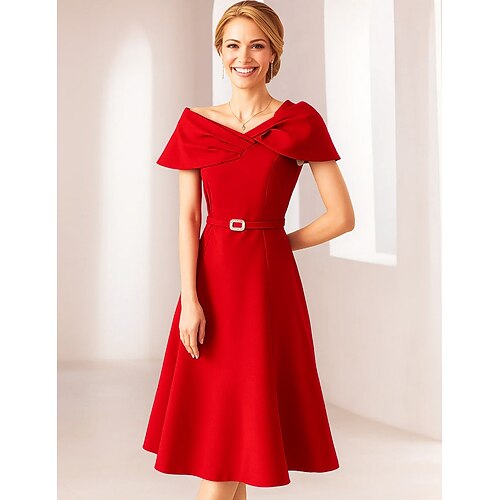 Abito da Festa Knee Length A-Line Abito da Cocktail Abito per Ospite di Matrimonio Abito Madre della Sposa Maniche Corte Spalle Scoperte Elegante Vintage Festa con Colore Solido