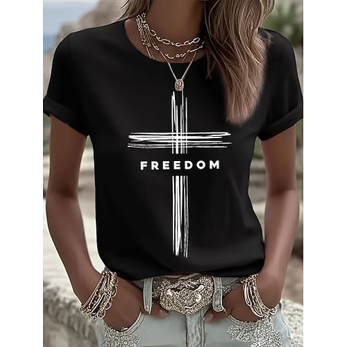 T Shirt patriottica delle donne per il Giorno dell'Indipendenza Grafica Lettera Vintage Elegante Classica Maniche Corte Collo A Giro Top Regolari Vestibilità Giornaliera Weekend Stampa Blu Nero