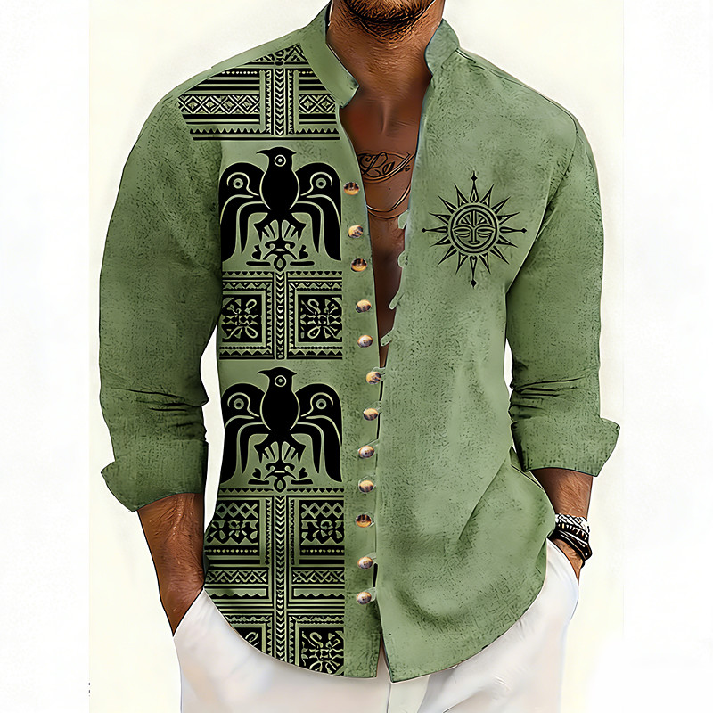 Men's Sun Totem Thunderbird Nordic Geometry Shirt Stand Collar Shirt Long Sleeve Vintage Retro Casual Vacation Spring Fall Mandarin Collar Band Collar 3D Print Button-Down Linen Like Shirt Blue Green