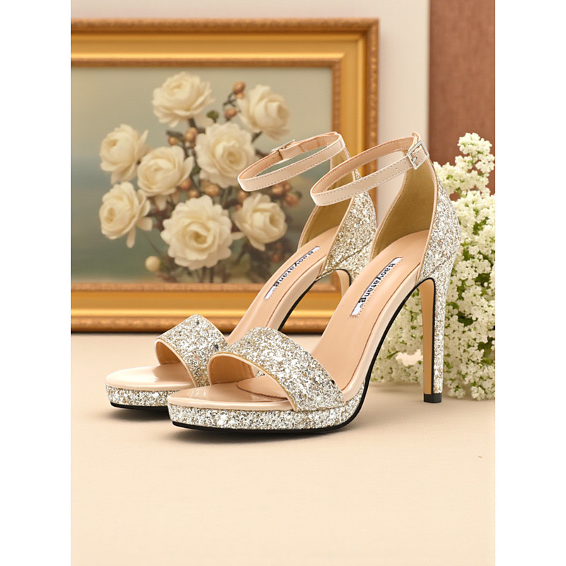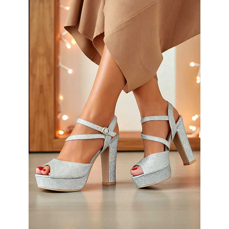 Women's Silver Glitter High Heel Sandals with Ankle Strap, Sparkly Nightlife Party Shoes for Club and Evening Outfits