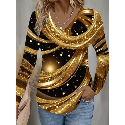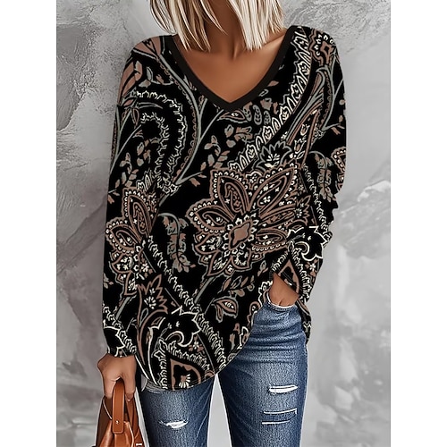 Per donna Maglietta Grafico Piante Tribale Vintage Elegante Classico Manica Lunga Scollo a V Top Regolari Quotidiano Stampato Nero Primavera Autunno Inverno