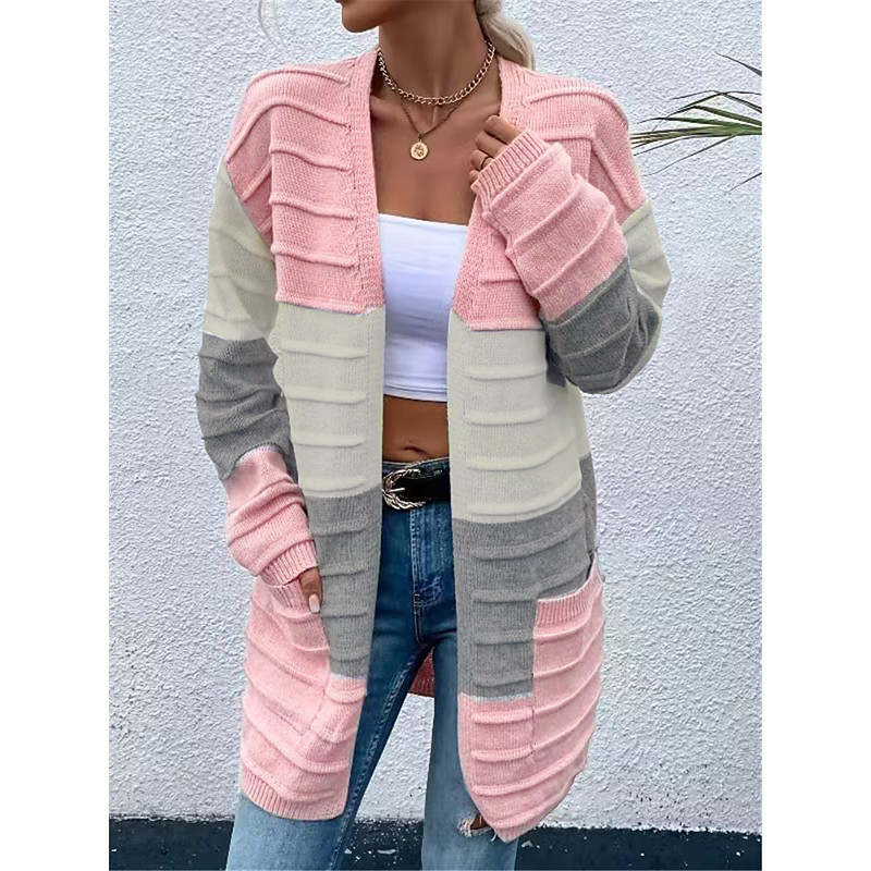 Women's Sweater Cardigan Casual Soft Color Block Ribbed Open Front Pocket Knitted Long Sleeve Long Tops Knit Outdoor Daily Weekend Pink Orange Fall Winter