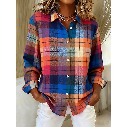 Per donna Camicia Blusa Plaid Casual Manica Lunga Colletto a Camicia Top Regolari Quotidiano Patchwork Bottoni Stampato Blu Verde chiaro Rosa Rosso Arancione Primavera Autunno Inverno
