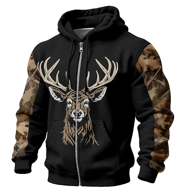 Men Zip Up Hoodie Deer Head Graphic Camouflage Sleeve Hunting Sweatshirt Tactical Outdoor Wildlife Hooded Jacket Black Clothing Apparel S M L XL XXL XXXL