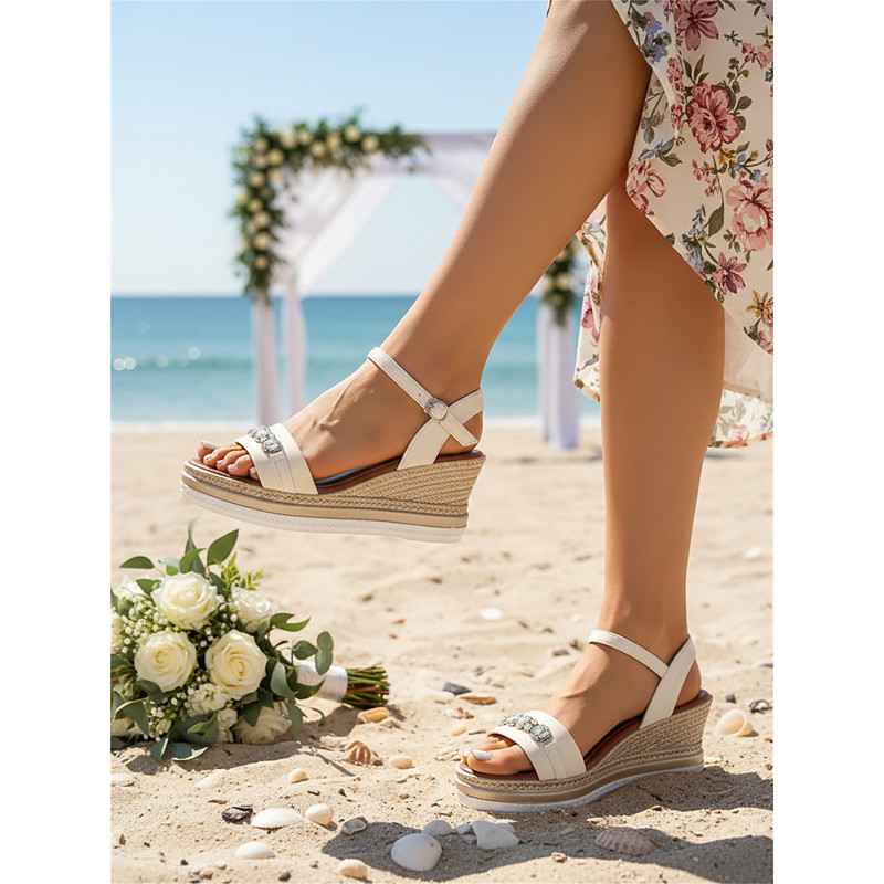 Women's White Wedge Sandals with Crystal Detail – Comfortable, Stylish Footwear for Beach Weddings, Perfect for Brides and Guests