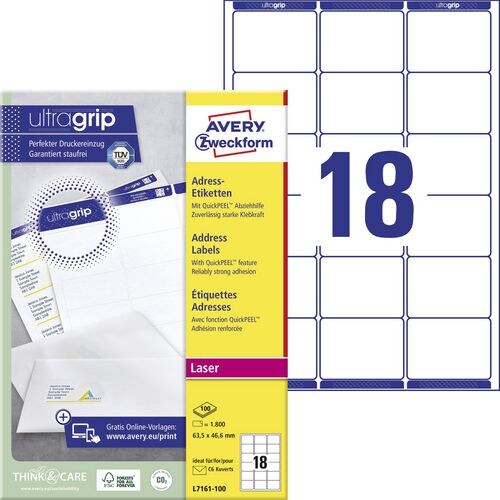AVERY Zweckform Abziehhilfe QuickPEEL,ultragrip Adressetiketten L7161-100 haftend DIN A4 Weiß 63,5 x 46,6 mm 100 Blatt à 18 Etiketten