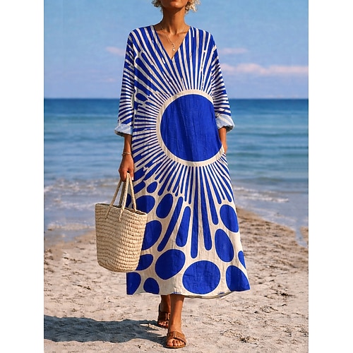 Damen Maxi Kleid Leinenähnlich Atmungsaktiv Leicht Kaftan 3/4 Länge Ärmel Rundhals Lässiges Shift Kleid A-Linie Kleid Boho Alltag Urlaub Ausgehen Geometrisch Pink Grün Frühling Herbst