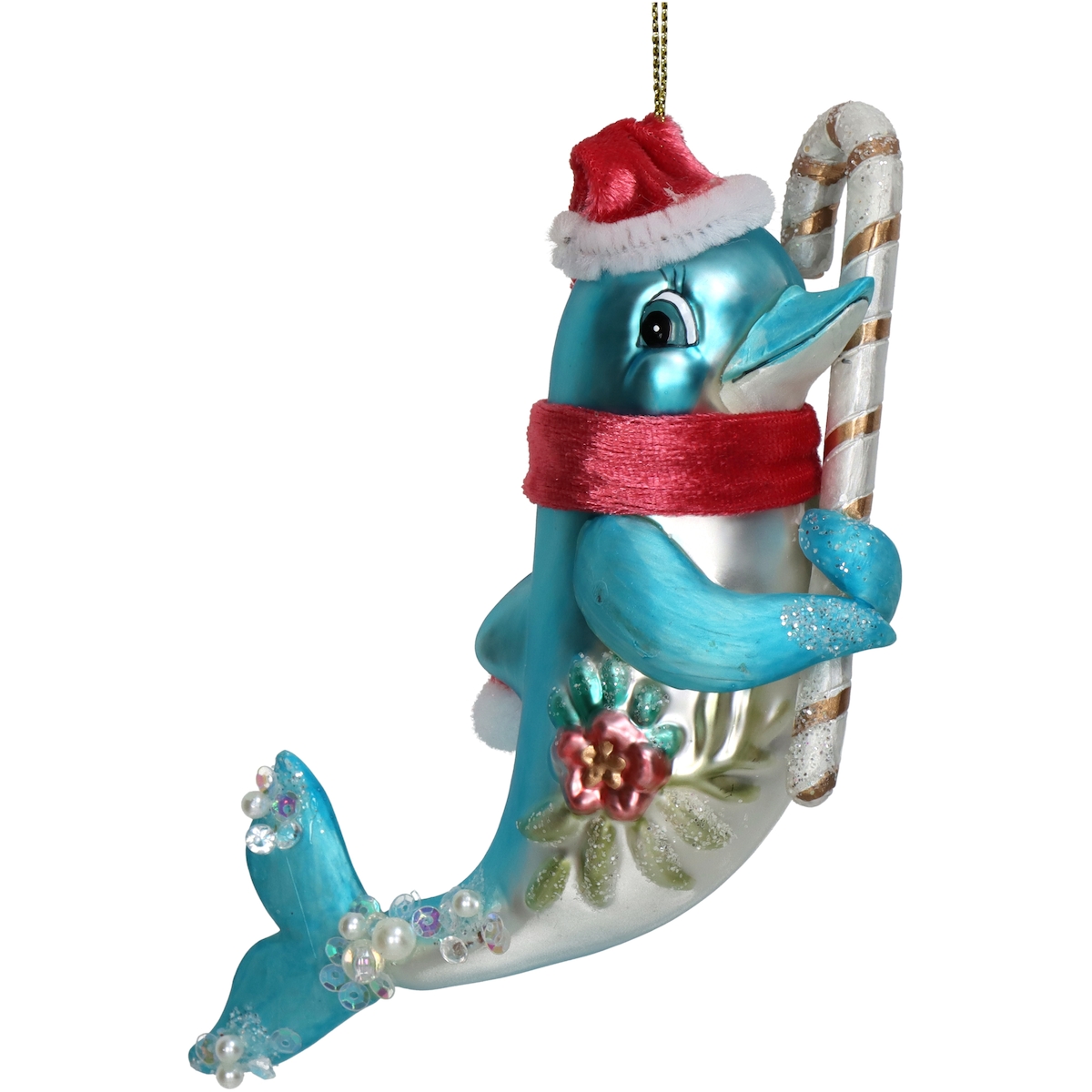 Christbaumschmuck Glas 16,7cm Delfin mit Zuckerstange Figur Weihnachtsbaum Anhänger Weihnachten Christbaumanhänger Weihnachtsbaumschmuck Blau