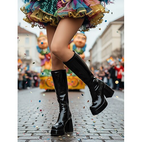 Stivali platform viola retrò anni '80 al ginocchio con tacco a blocco di Mardi Gras per donna - Ecopelle lucida perfetti per parate di carnevale e celebrazioni festive