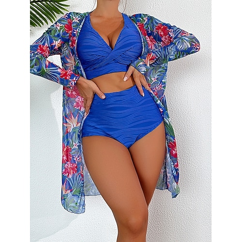 Costume da bagno bikini da donna in 3 pezzi schiena scoperta estate in spiaggia foglie floreali scollo a V senza maniche