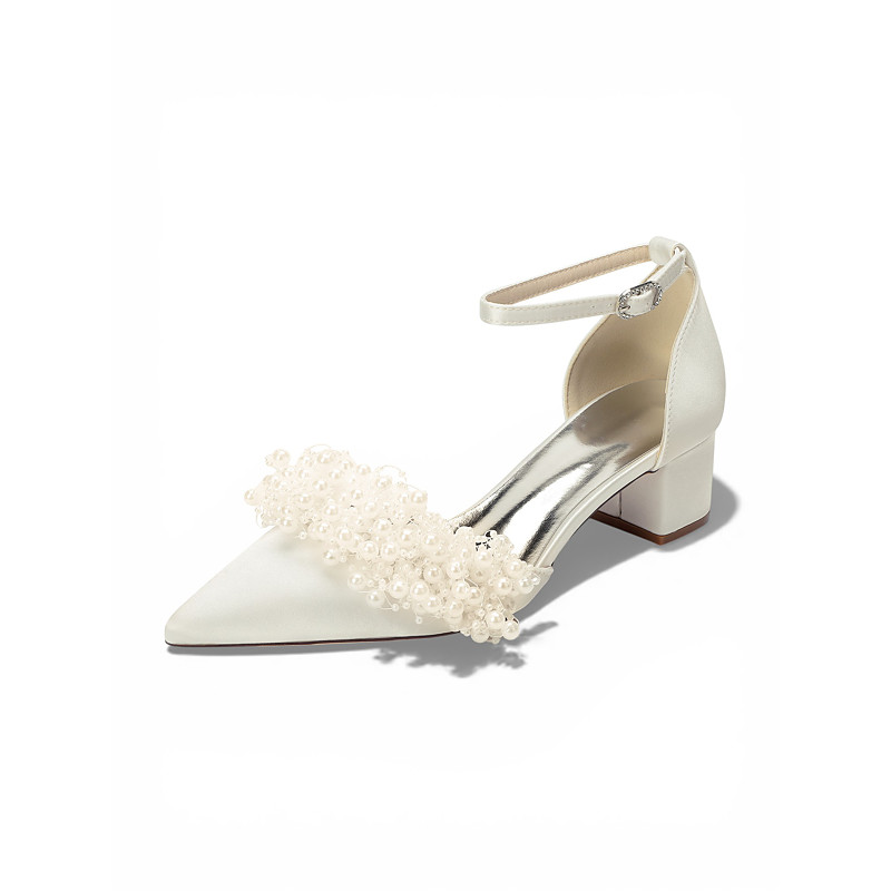 Women's Ivory Pearl Embellished Ankle Strap Heels, Elegant Pointed-Toe Bridal Shoes for Modern City Wedding