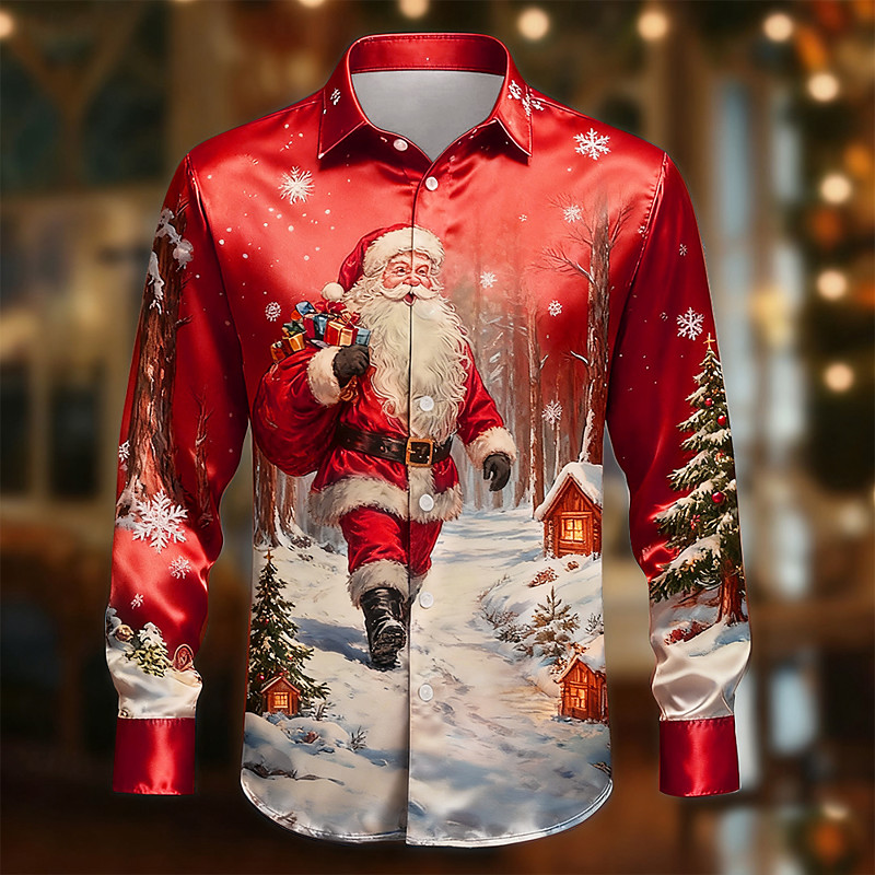 Christmas Men's Santa Claus Christmas Tree Snowflake Shirt Satin Shirt Dress Shirt Long Sleeve Fashion Casual Outdoor Party Holiday Spring Fall Turndown 3D Print Button Up Shirts Blue 1# Red Blue