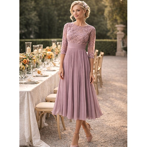 Linea ad A Lunghezza Tè Vestito da Festa Abito da Cocktail Abito da invitata a nozze Abito da cerimonia per signora Manica 3/4 Girocollo Elegante Ospite di nozze Festa di fidanzamento Chiffon Pizzo