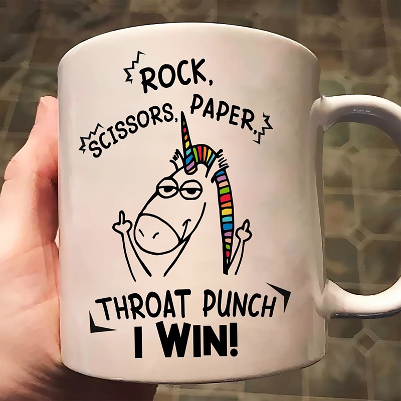 Funny Gift Mug Rock Scissors Paper Throat Punch I Win Hilarious Coffee Mug for Office Friends Gag Gift Unique Funny Cup for Work or Home