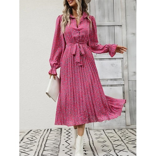 Per donna Abito Midi Abito a trapezio Casual Quotidiano Vestibilità regolare Floreale Manica Lunga Bavero Nero Fucsia Verde Primavera Autunno