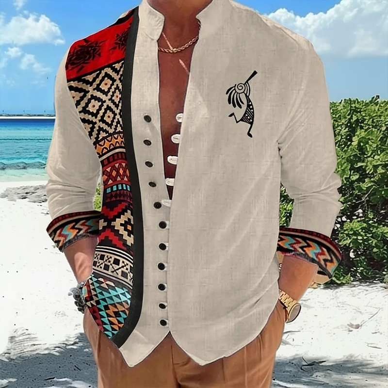 Men's Geometric Pattern Ethnic Indian Culture Shirt Button Up Shirt Stand Collar Shirt Long Sleeve Vintage Retro Daily Outdoor Vacation Spring Fall Mandarin Collar Band Collar 3D Print Linen Like