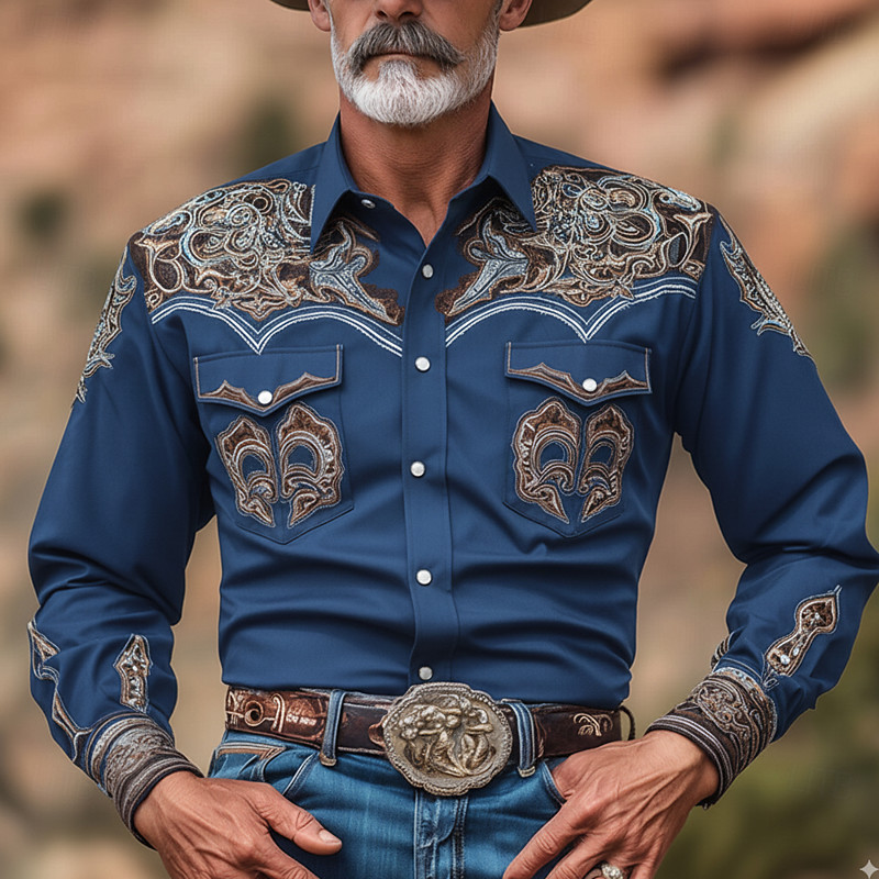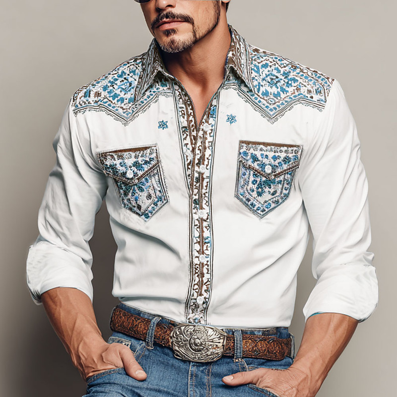 Men's Ethnic Intricate Floral Flowers Shirt Western Shirt Cowboy Shirt Long Sleeve Vintage Retro Outdoor Casual WorkWear Spring Fall Turndown Front Two Pockets Linen Like Shirt Button Up Shirts Blue