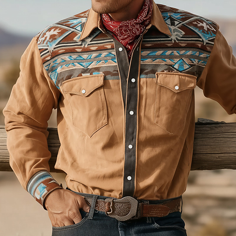 Men's Aztec Ethnic Indian Culture Shirt Western Shirt Cowboy Shirt Long Sleeve Vintage Retro Outdoor Casual WorkWear Spring Fall Turndown Front Two Pockets Linen Like Shirt Button Up Shirts Blue