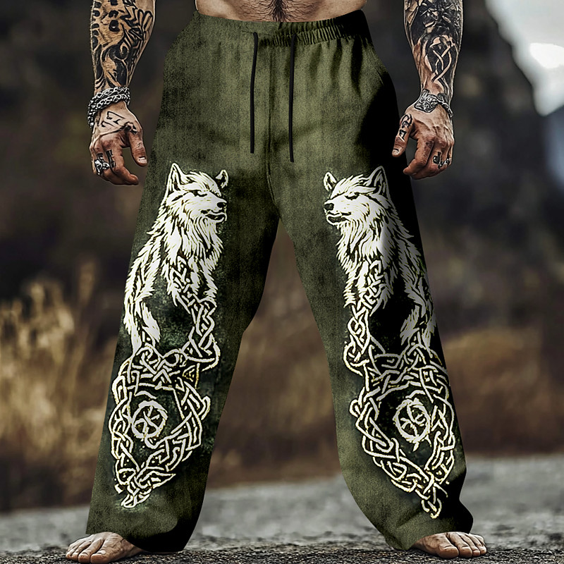 Men's Wolf Viking Celtic Art Trousers Baggy Pants Casual Pants Mid Waist Vintage Retro Outdoor Casual Elastic Drawstring Waist Linen-Like Pants with Pockets Spring Fall 3D Print Black Brown Green