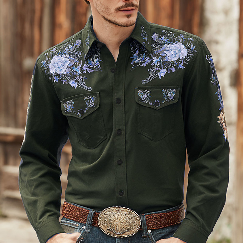 Men's Floral Print Ethnic Flowers Shirt Western Shirt Cowboy Shirt Long Sleeve Vintage Retro Outdoor Casual WorkWear Spring Fall Turndown Front Two Pockets Linen Like Shirt Button Up Shirts Blue