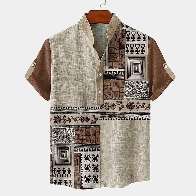 Men's Geometric Pattern Tribal Ethnic Shirt Button Down Shirt Short Sleeve Vintage Retro Holiday Casual Daily Summer Spring Standing Collar Henley Collar 3D Print Linen Like Shirt Dark Khaki