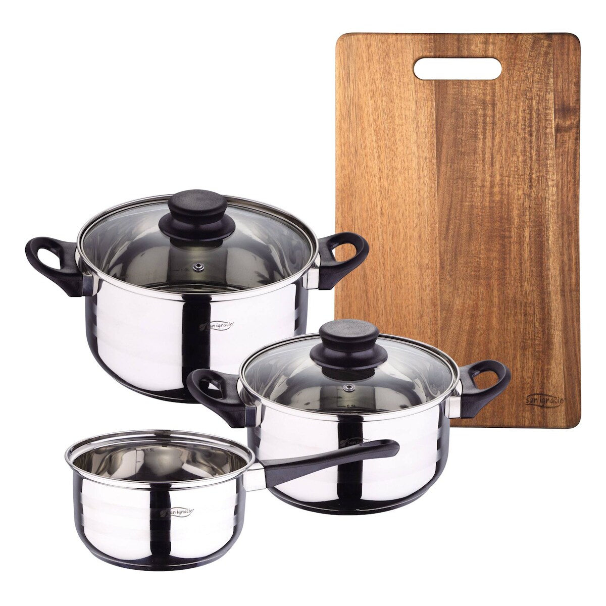 BERGNER - 5-teiliges Kochset 16/18/20 cm aus Edelstahl induktionsgeeignet mit Schneidebrett 40,3×25,2×2,5 cm aus Akazienholz NOIA