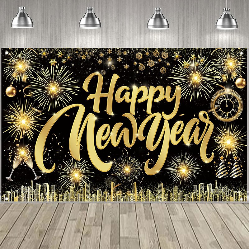 New Years Eve Party Black and Gold Decorations Sequin Backdrop – Glitter Black Gold Fabric Banner for 2026 Happy New Year Party, Photo Booth Holiday Celebration Decor