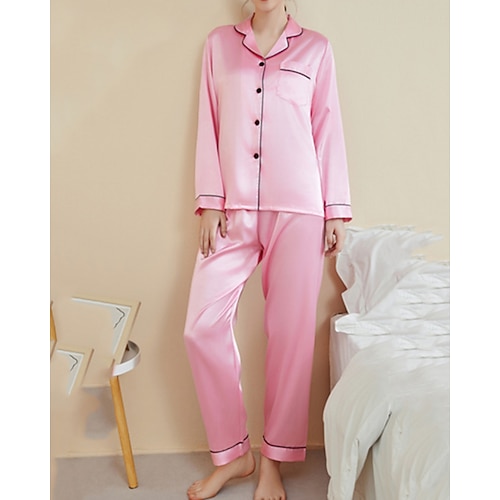 Per donna Pigiama Abbigliamento da Casa Set Pigiama Casual Morbido Raso Colore Puro Bottoni Pantalone Quotidiano Casa Da letto Manica Lunga Colletto a Camicia Blu Rosa chiaro Nero Champagne Rosa