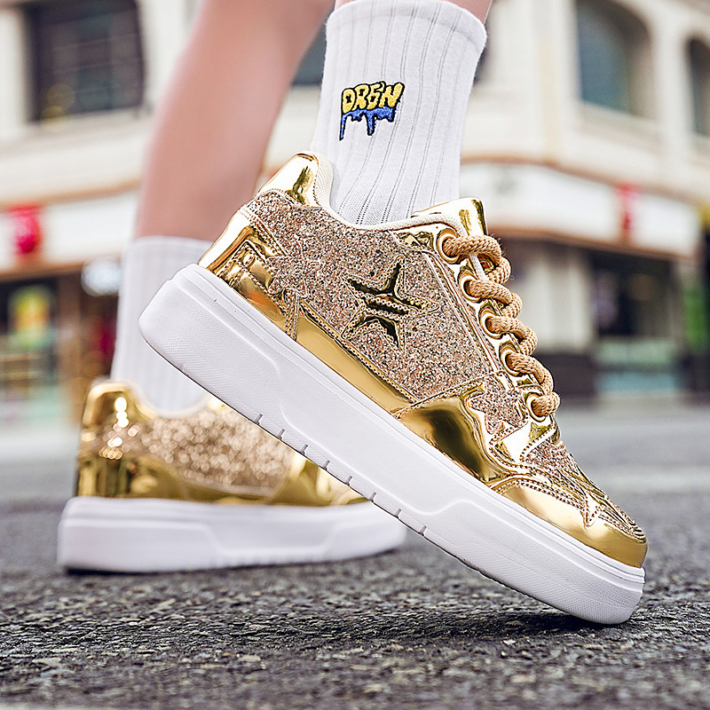 Women's Gold Sequin Mesh Slip-On Sneakers with Platform Sole - Stylish Casual Shoes for Parties and Special Occasions