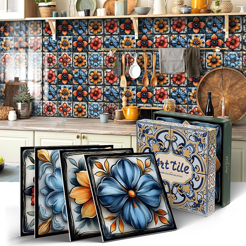 24pcs Moroccan Style Tile Stickers, Thickened Crystal Film PVC Wall Decals, Waterproof Oil-proof, Removable Retro Tile Wall Decor for Bathroom Kitchen Vintage Home