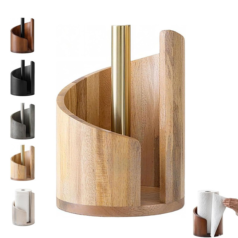Mountain Paper Towel Holder Countertop with Mango Wood Round Base and Metal Holder, Wood and Metal Paper Towel Holders Countertop, Spiral Design Decorative Storage Box for Bathroom Storage